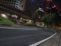 A stunning view of a city at night, showcasing modern architecture, a bridge, and a beautiful mix of artificial light and street lights.