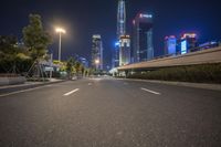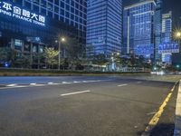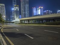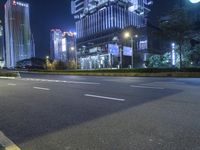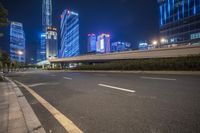 A view of a city at night, showcasing its modern architecture and vibrant neon lights