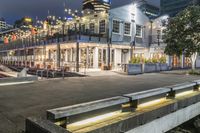 A stunning view of a city at night, with tall skyscrapers, illuminated street lights, and a bustling urban atmosphere.