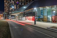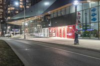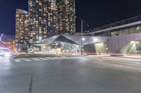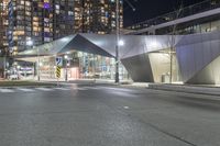A stunning view of the modern architecture and city life in Toronto, Canada, with illuminated buildings and street lights at night.