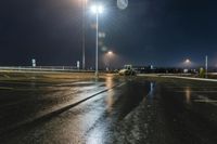 a fork lift is driving through a parking lot at night time with lights on in the background