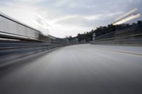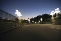 A long exposure shot of a car driving on a highway in Los Angeles, California, USA. The road is illuminated by street lights and the headlights of passing vehicles, creating a beautiful motion blur effect. The city skyline can be seen in the distance, with the silhouette of a bridge and the straight road leading into the horizon.