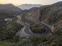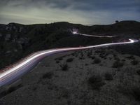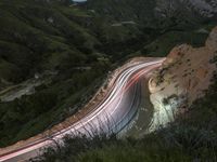 Aerial view of a highland road in California, USA, surrounded by mountains and nature. The dark landscape is illuminated by artificial light, creating light streaks on the elevated road surface. The motion blur captures the sense of speed and adventure on this highway through the mountain pass.