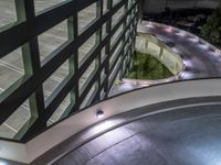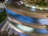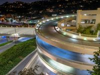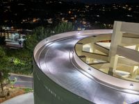 An aerial view of the city of Los Angeles at night, with its roadways, parking lots, and parking decks illuminated by artificial light and street lamps, highlighting the urban design and the curves of the road.