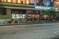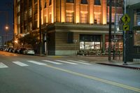 A stunning view of the classic architecture and vibrant city lights of Los Angeles at night, with illuminated street lights and a clear sky above the bustling urban streets.