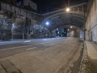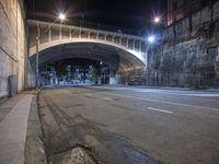 A view of a city at night with a bridge and underpass. The roads are illuminated by street lights, providing a bright and urban design. The clear sky and dark surroundings create a captivating scene.