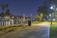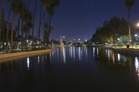 A stunning view of the Los Angeles cityscape at night, with the lights reflecting on the calm water of a nearby lake. The residential area is surrounded by open spaces and nature, with trees and palm trees adding a touch of greenery. The artificial lights illuminate the suburban neighborhood, creating a beautiful contrast with the dark sky. The metropolitan area is filled with recreational areas, including parks and paths, offering residents and visitors a chance to enjoy the urban oasis.