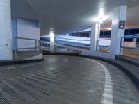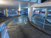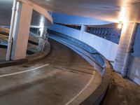 A dark, urban cityscape of San Francisco, California, USA, is illuminated by artificial light in this nighttime photo. The concrete street curves down the road, with a parking lot and street lights visible. The image captures the entry and exit points of the highway ramp, and an Armco barrier can be seen on the low, elevated slope.