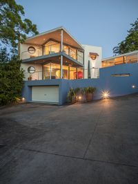 A clear sky illuminates a residential suburb at night, showcasing the urban design with buildings, houses, and artificial lights.