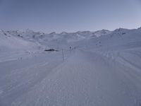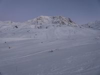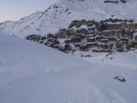 The sun rises over a snow-covered mountain range in the French Alps, revealing a cliff-face, glacial terrain and ski slope. The view from the Nunatak is an iconic tourist attraction in winter, with its open space and wide overlook of the valley and mountain landforms.