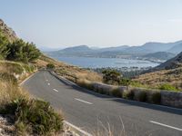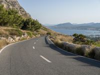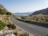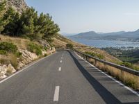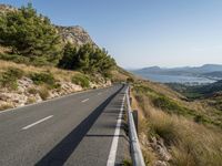 A view of Armco barrier along a coastal road, leading straight down to a jetty in Mallorca, Balearic Islands, Spain. The clear sky and the mountain in the background contrast with the asphalt and ocean below.