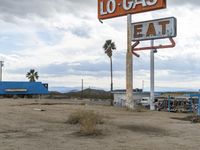 A motor vehicle travels along an open, rugged road surface surrounded by a natural environment of sand, dirt, and gravel in the Nevada desert. The landscape features a combination of mountains, trees, and vegetation as far as the eye can see, with a city on the horizon and a lake in the distance. Clouds, overhead power lines, traffic signs, and a gas station are also visible.