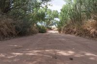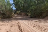 A low and sandy road winds its way through the red rock canyons of Utah's Canyonlands. The lush green bushes and gravel surface add to the beauty of the off-road track in Cedar Mesa, overlooking Comb Wash.