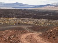 A winding dirt path leads through the rugged mountain landscape, dotted with tree and shrub vegetation, and surrounded by brown and grey sand and gravel surfaces, outcrops and rock formations. The horizon is framed by a cumulus cloud, while the surface is dotted with Aeolian landforms, like makhtesh and hill profiles.