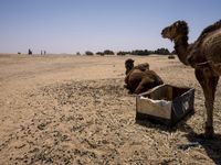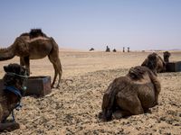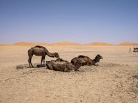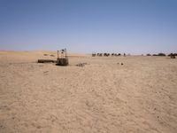 A 4x4 vehicle drives across the gravel track of the Maroccan desert, past rocky outcroppings and sand dunes. The clear sky and open space of the Sahara steppe creates a beautiful landscape of nature, with ancient history and a unique ecosystem of Aeolian Landforms, singing sand, and wadi dunes. A solitary Arabian camel stands in the distance, a reminder of the recreational and cultural importance of the area, despite the drought and challenging conditions.