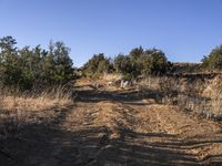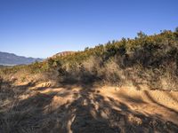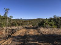 A dirt road winds through the rugged landscape of Yunnan province in China, with a clear sky and hard shadows from the mountain landforms, vegetation and trees. This track is popular for recreational off-roading, as well as for taking in the unique sand street, soil, grass, rock and cloud formations of the natural environment.