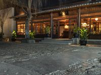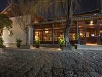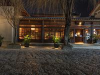 The cobble stone road of an old village in Lijiang, Yunnan, China, illuminated by artificial light at night. A low building with a tree, property and cafe, and a concrete street with hotel and restaurant facades, can be seen in the profile of the old town. This historic architecture is a great example of real estate, paver and flooring in Yunnan, China.