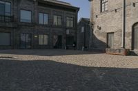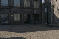 A classic brick wall, cobblestone alleyway, and winding roads showcase the beautiful architecture of a residential neighborhood in Beijing, China, on a sunny day.