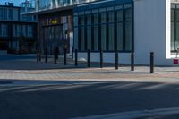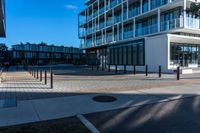 A view of modern architecture and urban design in Toronto, Canada, with a clear sky and hard shadows on the asphalt surface.