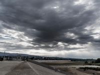 An empty gravel road stretches out in front of a bright blue sky, leading to an unknown destination.