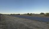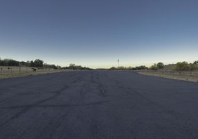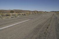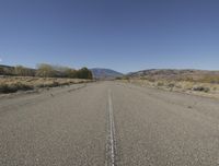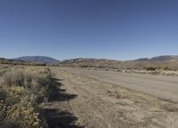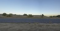 A view of a winding road in California, USA, with a clear sky and the sun shining on a beach, tree, and mountain landforms in the background. The yellow chaparral, grass, and dirt surfaces of the field and prairie stretch out to the horizon in a panorama of the natural environment.