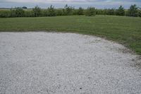 A grey sky hangs over a winding curved road through a rural landscape in Bancroft, Iowa, USA. The landscape features an open field of grass, a pastured plain, a wetland, a gravel driveway, and a farm with a barn and a shed. The road surface is made of asphalt, concrete, dirt, and lawn. The property is surrounded by soil, an agricultural lot, and a path.