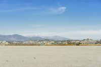 An aerial view of Los Angeles, California, USA showcases its open roads and suburban landscape, with rolling hills, mountains, and a clear blue sky in the background.