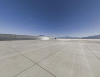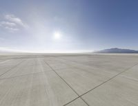 A clear sky shines over the runway of the Los Angeles airport in California, USA. The sea, sand and natural environment can be seen in the distance, while the wing of an airplane is visible against the calm atmosphere and concrete surface of the airfield. The sun is visible in the horizon, making for a perfect sunny day.