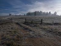A beautiful open space with rural landscape in a field, featuring green grass, trees, and a wooden fence under a clear blue sky.