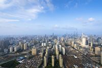 A stunning view of the skyline of Shanghai, China, showcasing its modern architecture and high-rise buildings during the day with clouds and contrails in the sky. The bustling metropolis of Shanghai is a vibrant urban city in Asia.