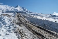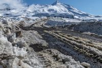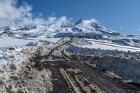 A breathtaking view of the New Zealand landscape with snow-capped hills, cloud-filled skies, and a winding dirt road