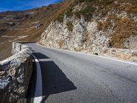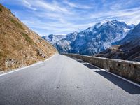 The Stelvio Pass, located in the Italian Alps of South Tyrol, is a winding mountain road offering an overlook of the alpine highland. The winter landscape is covered in snow and the road is lined with stone walls, Armco barriers, and lanes of asphalt. The day reveals a clear sky with cloud and contrail details.