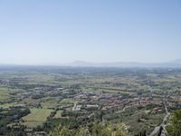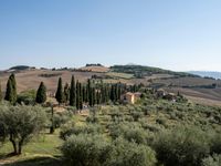 A breathtaking view of the Tuscany countryside showcasing the lush green fields, picturesque valleys, and charming hilltop towns under a clear sky in Italy, Europe.