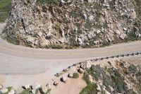 A scenic view of the winding Pacific Coast Highway, with its asphalt road cutting through the lush vegetation and rocky outcrops of the mountainside.