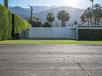 A lush suburban villa in the Sonora Desert of California, USA, with a gravel driveway and parking lot lined with green hedges, basking in the mid-day sunshine.