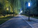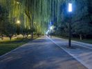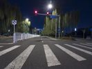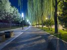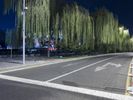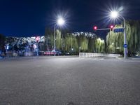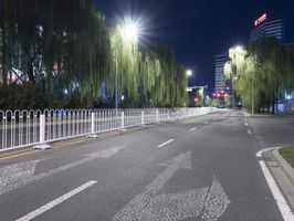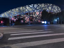 A night view of the bustling city of Beijing with its modern infrastructure, street lights, and iconic Bird's Nest Olympic Stadium, set against a clear blue sky and lush vegetation.