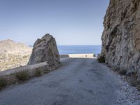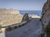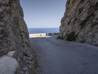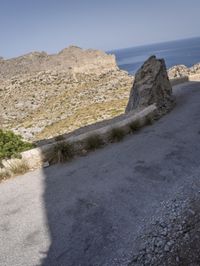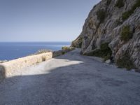 A scenic view of Mallorca, Spain, with the ocean shore, a rock wall, an Armco barrier, and a lush tree in the foreground, all in the backdrop of a majestic coastal landscape with terrains of rocks, cliffs and headlands, in a clear blue-azure sky on a sunny day.