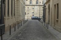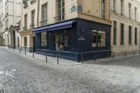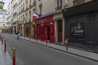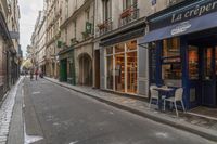 The blue hour in Paris, France. A gloomy alley-way lined with classic architecture, restaurants and stores, providing a view into the metropolitan area and its urban design.