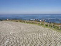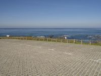A calm and peaceful parking lot with cobble stone paver, asphalt road surface and lake on one side, beach, wood fence, shore line and clear sky on the other, in Europe's Portugal. The azure water, sandy shore and warmth of the sunlight creates a peaceful and leisure atmosphere at this natural environment.