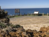 A coastal landscape in Europe featuring a parking lot with a mix of sand, dirt, grass, cobble stone, paver, gravel and a guard rail. The horizon is marked by the azure ocean, clear sky, tall trees and a lake in the foreground. High above, the Armco barrier and shade provide a sense of security from the bright sunlight and waves crashing onto the beach below.
