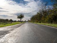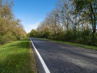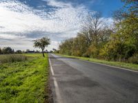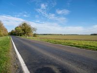 The rolling hills of Germany's countryside are filled with lush vegetation and agricultural land lots. The asphalt roadway is straight down the road, leading to the horizon, framed by the clear blue sky and cumulus clouds. The autumn colours of the leaves add to the natural environment of this rural landscape, illuminated by the sunlight.