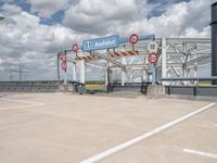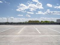 The modern architecture of a factory and warehouse in Berlin, Germany, are visible in the profile of the concrete street below and the open space of the parking deck and garage in the foreground. The clear sky is highlighted by the few white clouds that dot the sky.