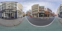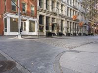 A view of the classic architecture and urban infrastructure in Manhattan, New York, USA. Pedestrians walk along the road, passing by a neighborhood of stores and shops on a bright day.