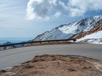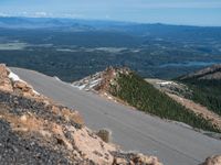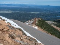 Perched high in the mountains of Colorado, the road to Pikes Peak offers a stunning aerial view of the snowy landscape. The asphalt road winds its way to the summit, providing an elevated perspective of the USA's natural beauty. Clouds drift lazily by as you overlook the picturesque scenery, with snow-capped peaks in every direction. This top-down view showcases the high position of Pikes Peak and the majesty of the surrounding mountainous terrain.