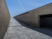 In the heart of Porto, Portugal, the clear sky casts hard shadows on the concrete walls and surfaces. The straight roads lead one quarter through the city, lined with pavers and walls creating a play of light and shadow. European charm is evident in the architectural design, with a mix of modern and traditional elements. Porto's streets showcase a blend of textures and surfaces, creating a unique urban landscape under the bright sun.