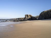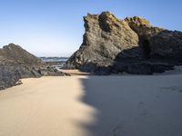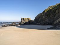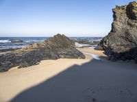 A view of the Portuguese coastline at dawn, with the azure ocean, beach sand, and rocky terrain illuminated by the rising sun. In the backdrop, the mountains and tree formations stand in stark contrast to the hard shadows and clear sky, providing a majestic landscape of both land and water resources.