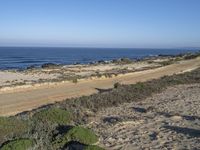 A summer day in Portugal reveals a coastal landscape along a road. The clear sky casts azure hues and shadows along the shoreline, while vegetation and mountain landforms line the horizon. The ocean and shore bring a tranquil atmosphere to the grass-covered plain.