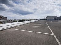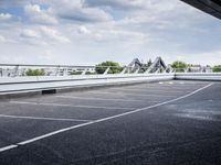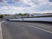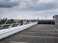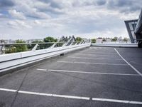 A view from the top down of the urban area of Berlin, Germany, featuring a mixed-use building with glass windows, a parking garage, a bridge, and a residential area. Automobiles travel along the highway and public transportation is visible, with a riverboat in the background. In the distance, a steel cantilever bridge and a suspension bridge can be seen.