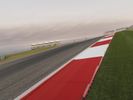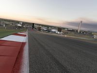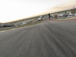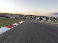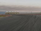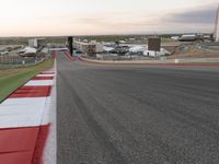 Early morning at a rural airfield, with a clear sky and a race track winding down the asphalt highway and across the grass, leading towards a grandstand and a finish line in the distance. Infrastructure and transport are key components to this air travel scene, with an airplane, automobiles, and a fixed link dome structure seen in the horizon.