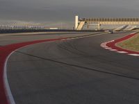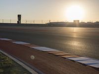 A picture of a highway leading to the horizon with a car racing along the curved asphalt, its headlights illuminated in the setting sun. An infrastructure of line and structure, the road surface is a fixed link between a clear sky and the sea, with sunlight reflecting off the water